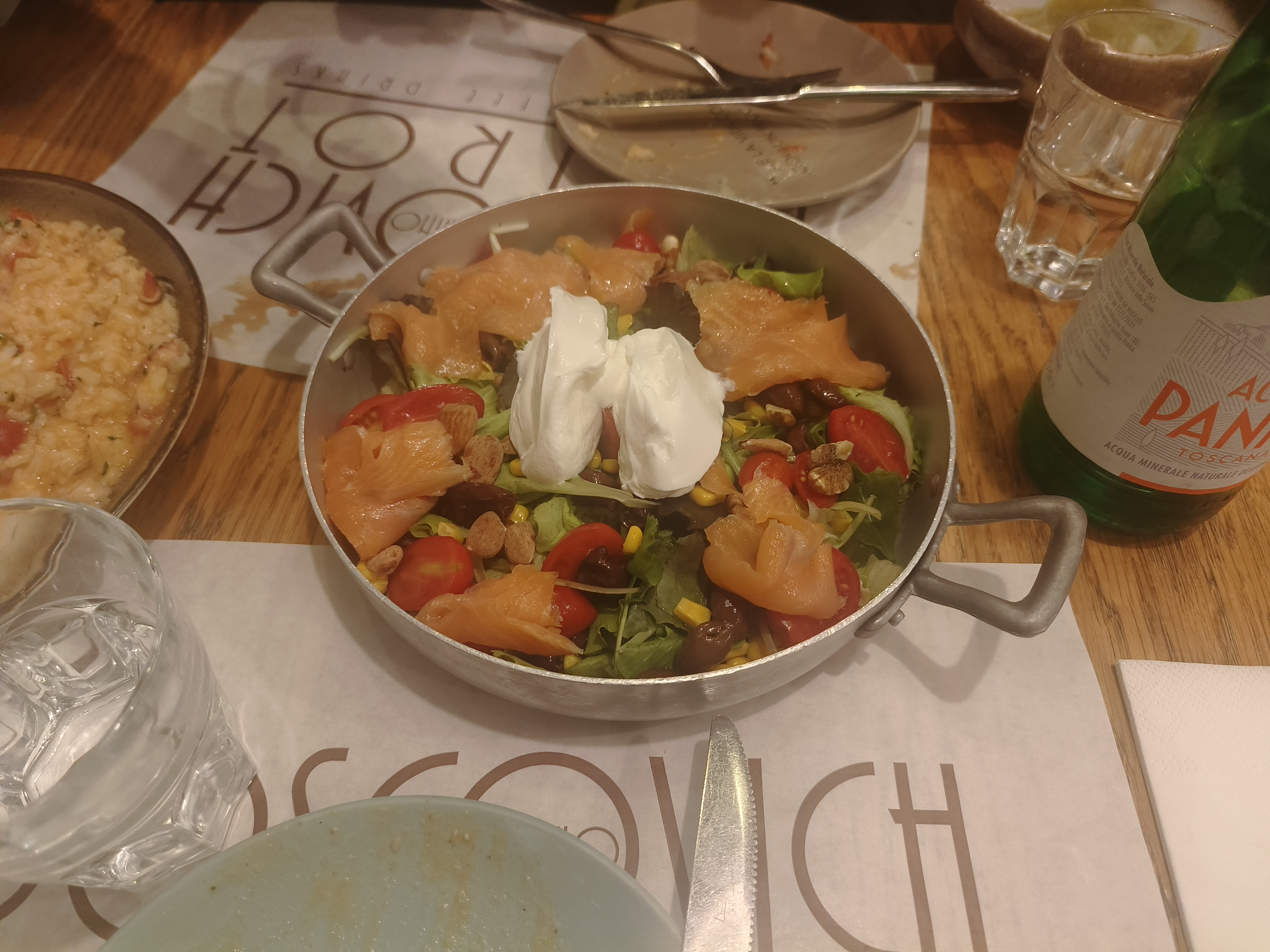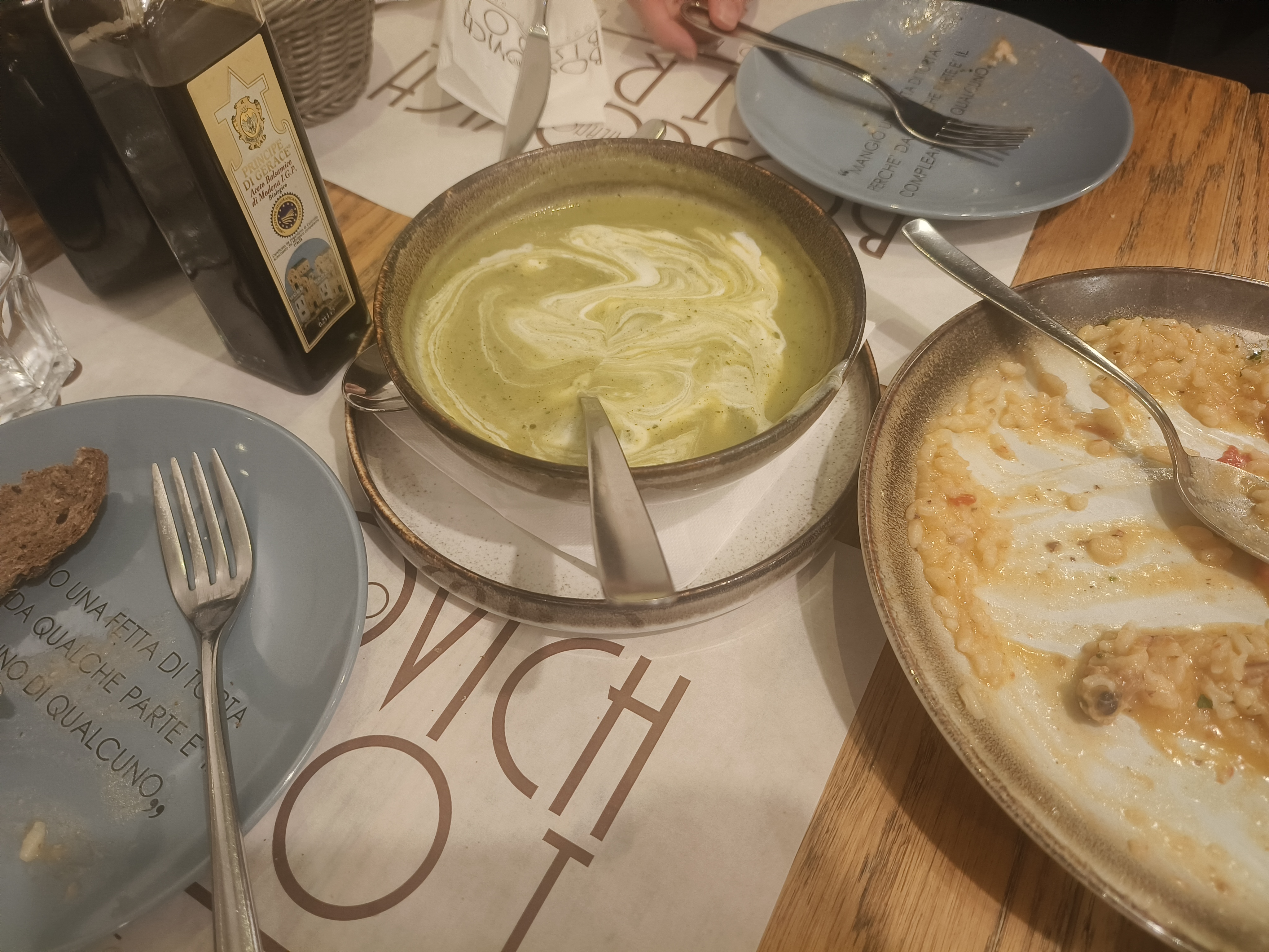 说到吃,在米兰的第一天中午吃的 Boscovich Bistrot,在这里吃了意大利一行的第一次披萨,没错,在临走的倒数第二天,我们才吃上披萨。结果不出所料,这么有名的食品,在全世界各地已经是一种味道了。反倒是这里的海鲜焗饭很香,还有三文鱼沙拉和绿色的奶油汤也很美味。