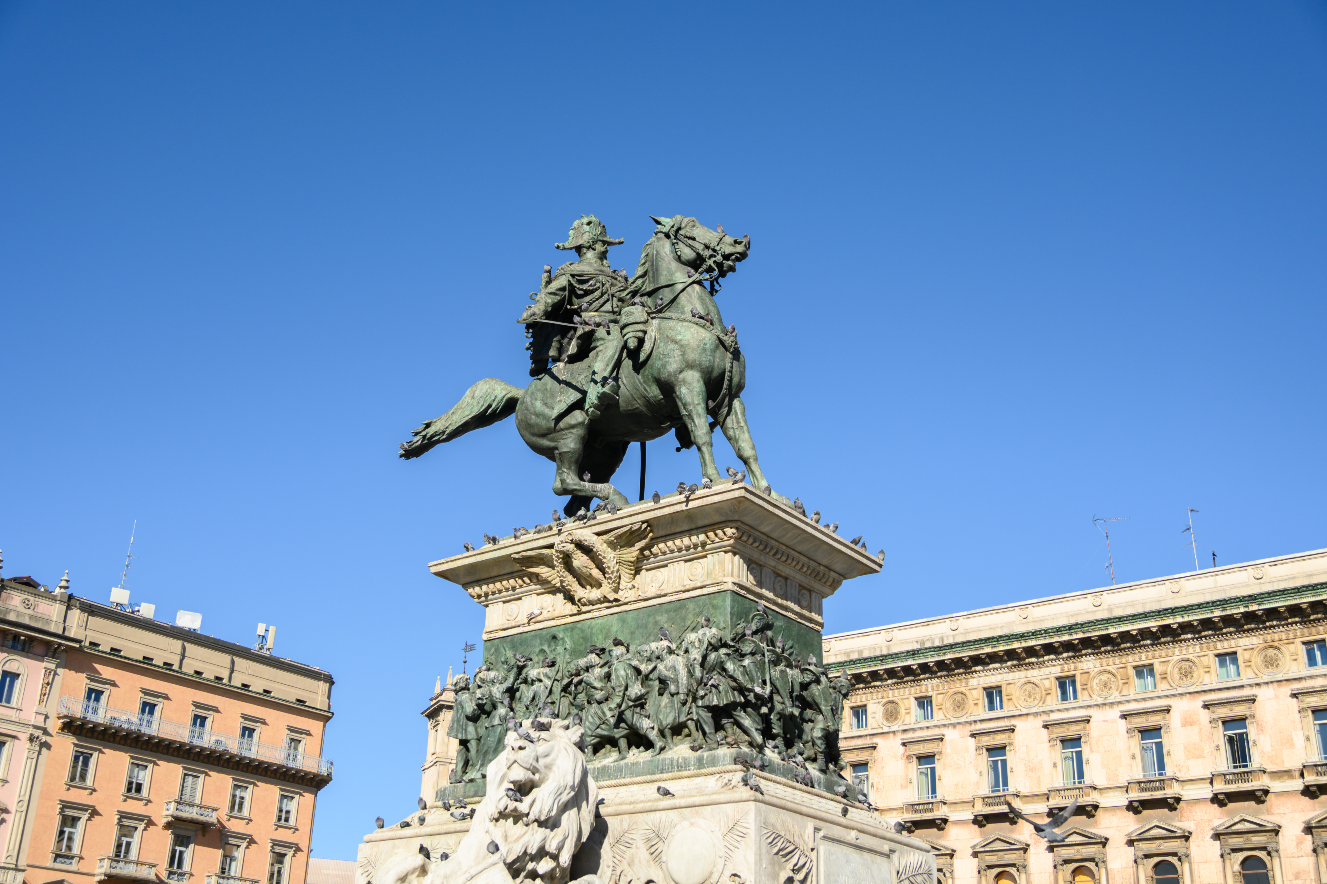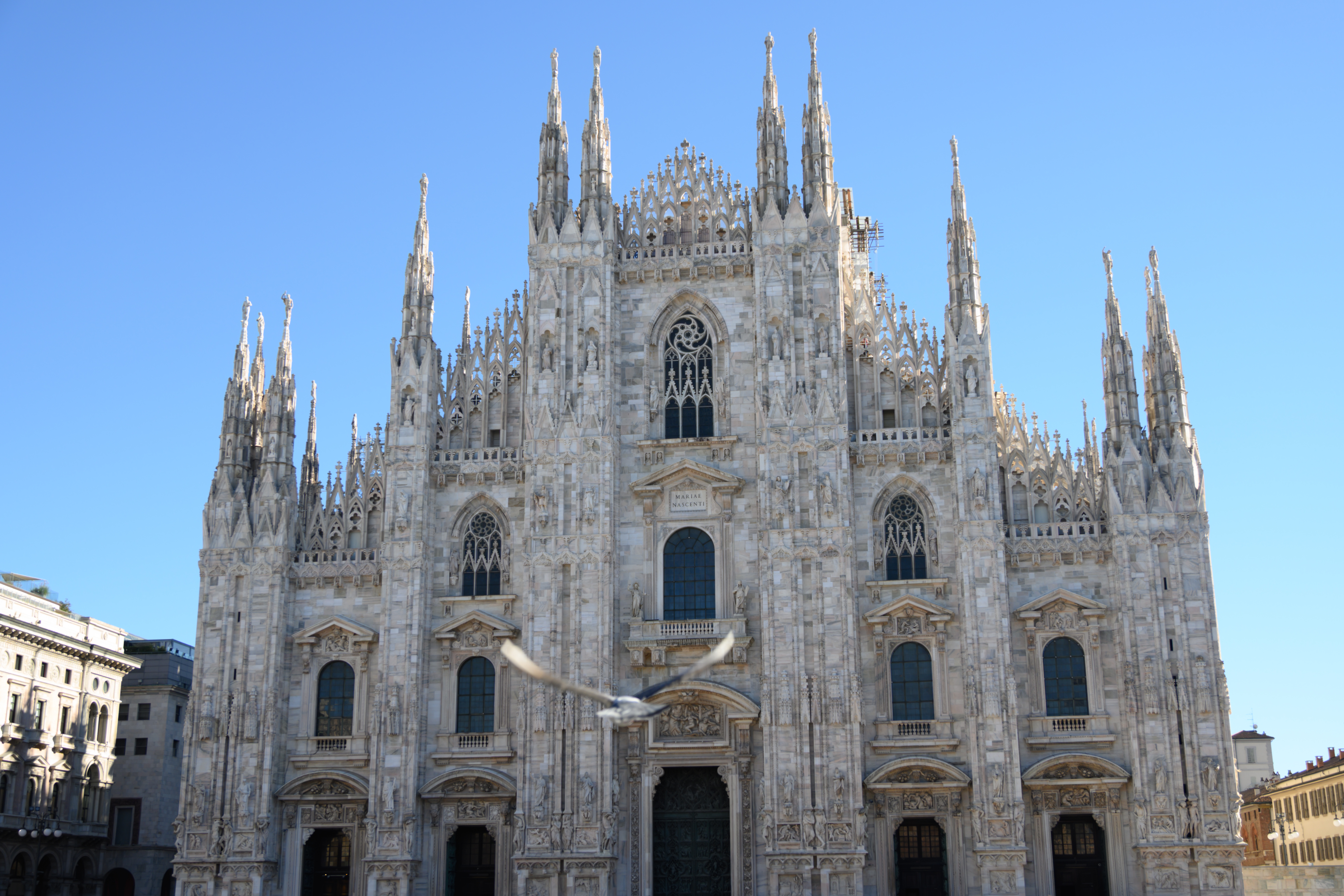 下了地铁,从地下走廊上台阶,先是看到一大群白鸽在空中盘旋,然后就是宏伟的米兰大教堂。