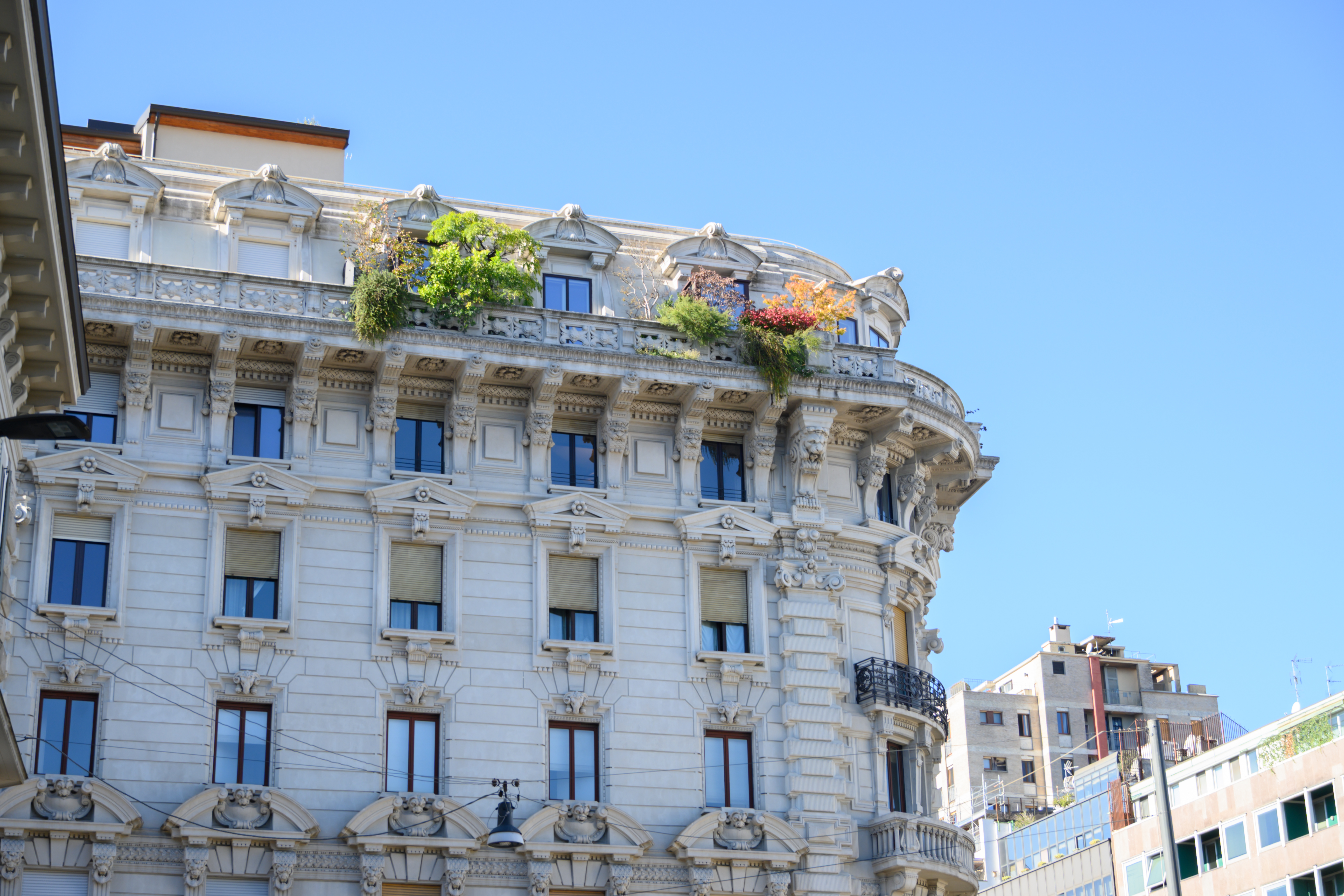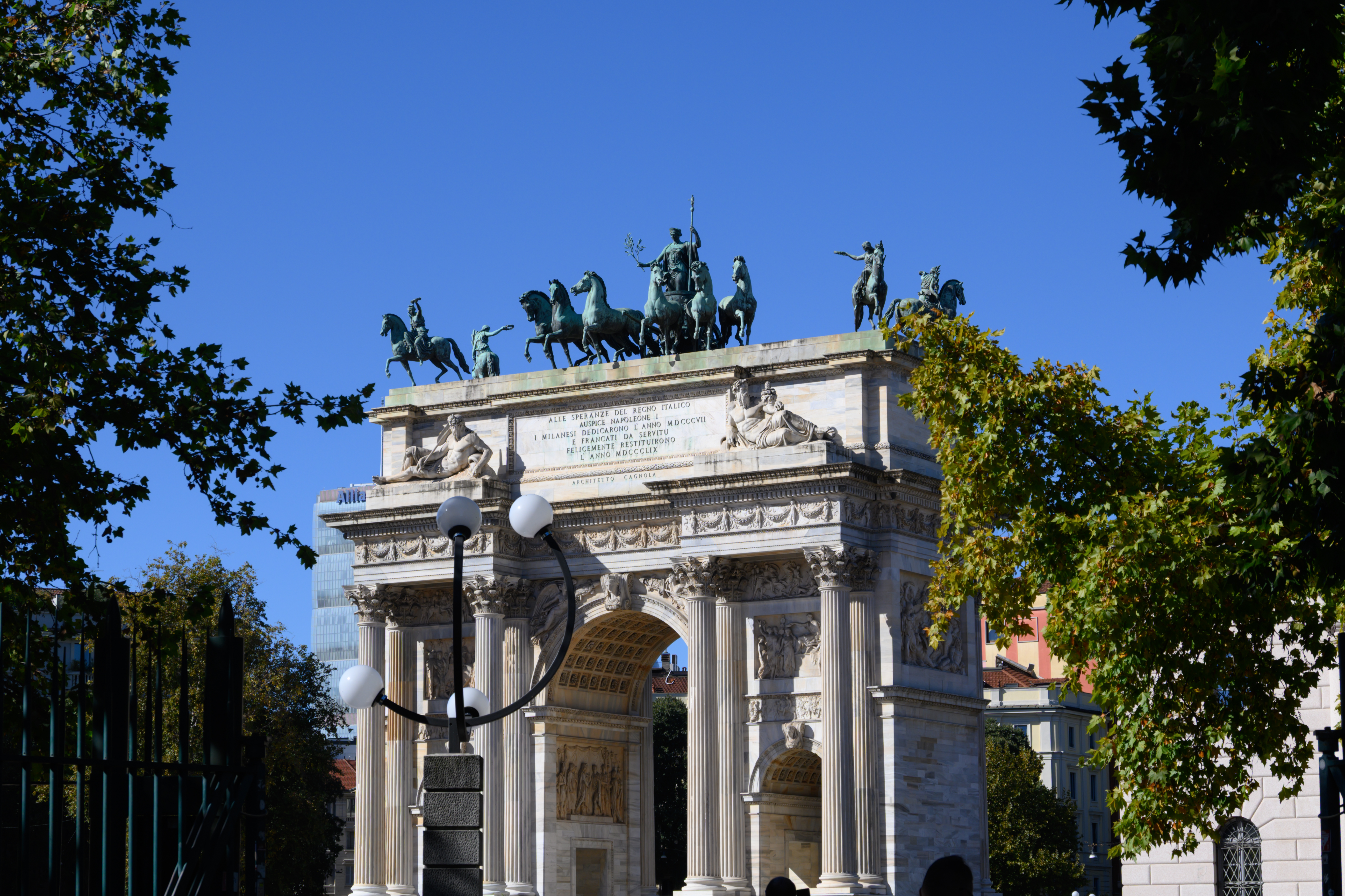 和平之门位于一个公园里面。我们决定从米兰大教堂步行去这个公园。不算近也不远,步行 20 分钟左右。路上的所有建筑都是如此好看,每栋楼都是武康大楼。米兰的晴天太能打了,但是阴天就丧失了很多颜色,我在一周后重返米兰,便见识了阴天的它。