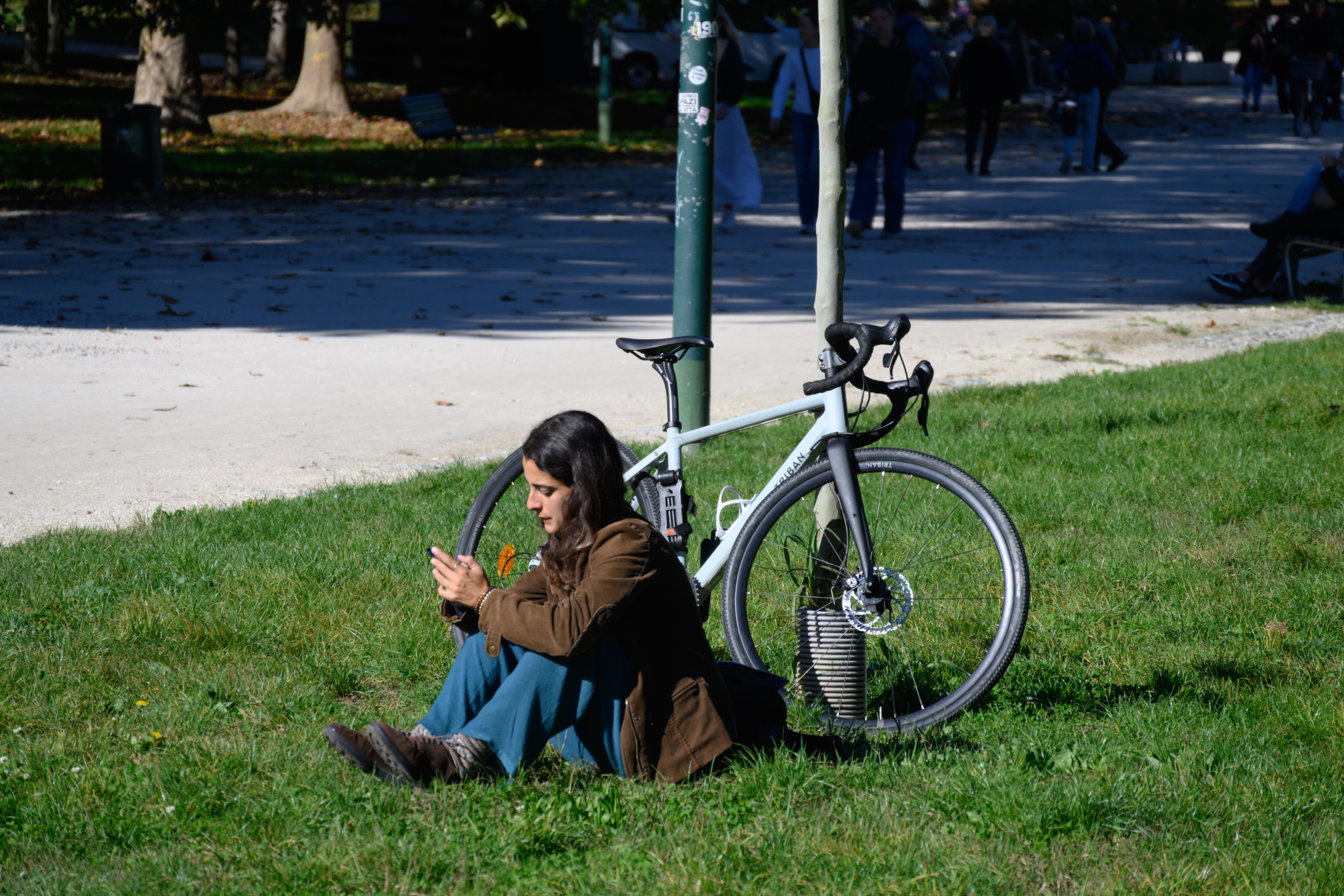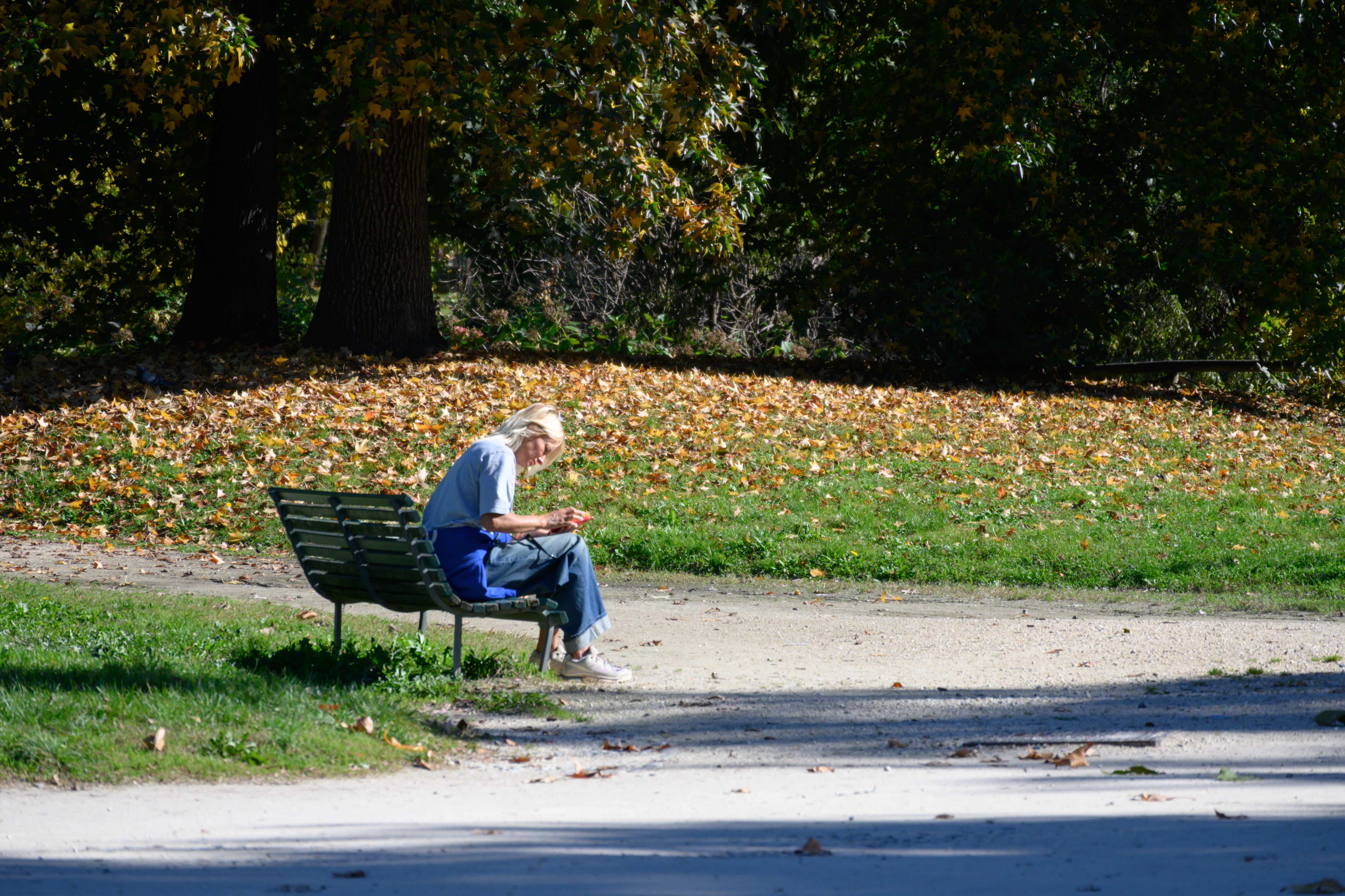 土地也不总是白色的,路当中有时会有断断续续粉色的区域,那是树掉下来的浆果,被行人碾碎染了地面。公园的路非常宽敞,人很多,都成了我眼中的风景。