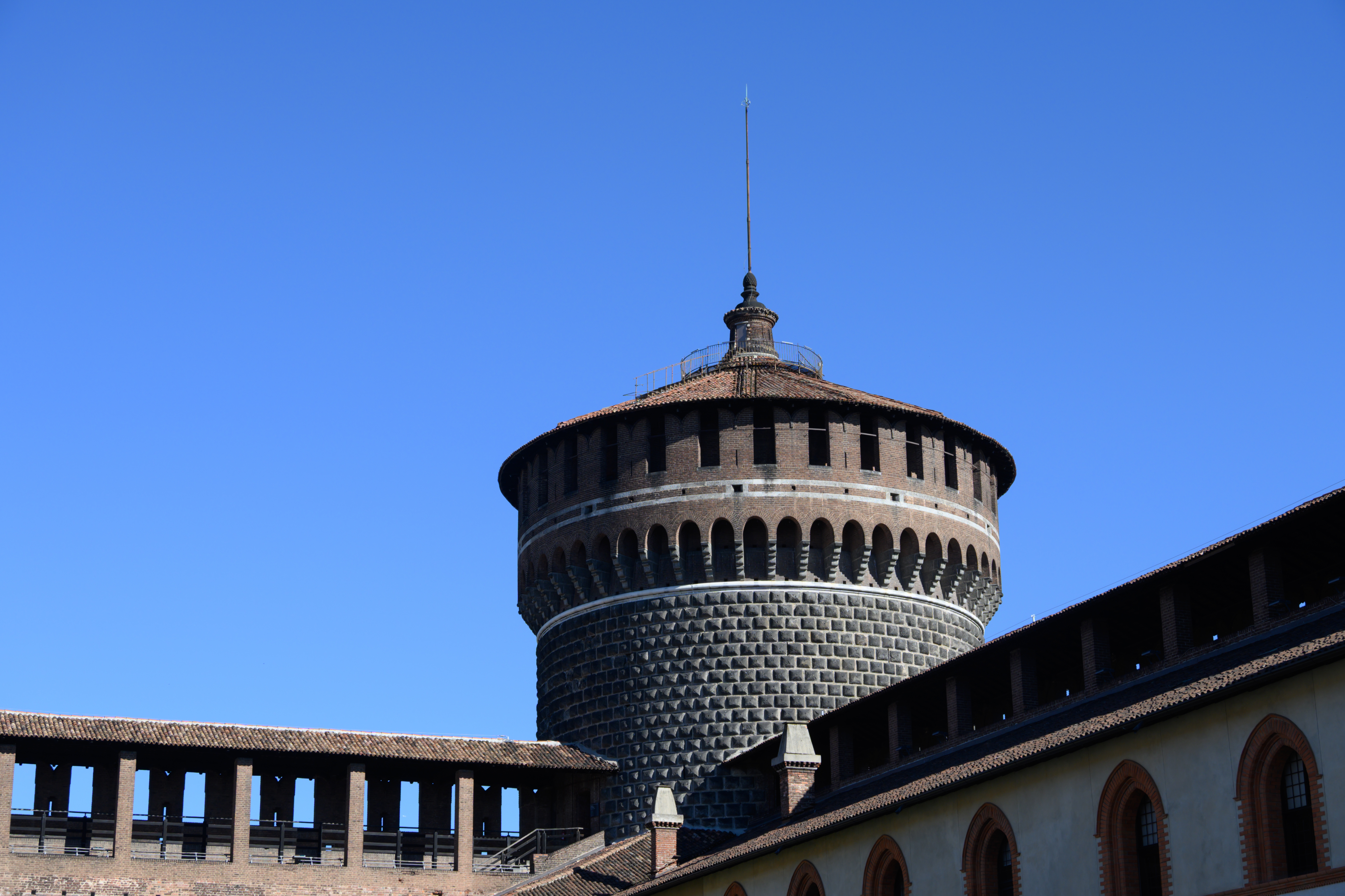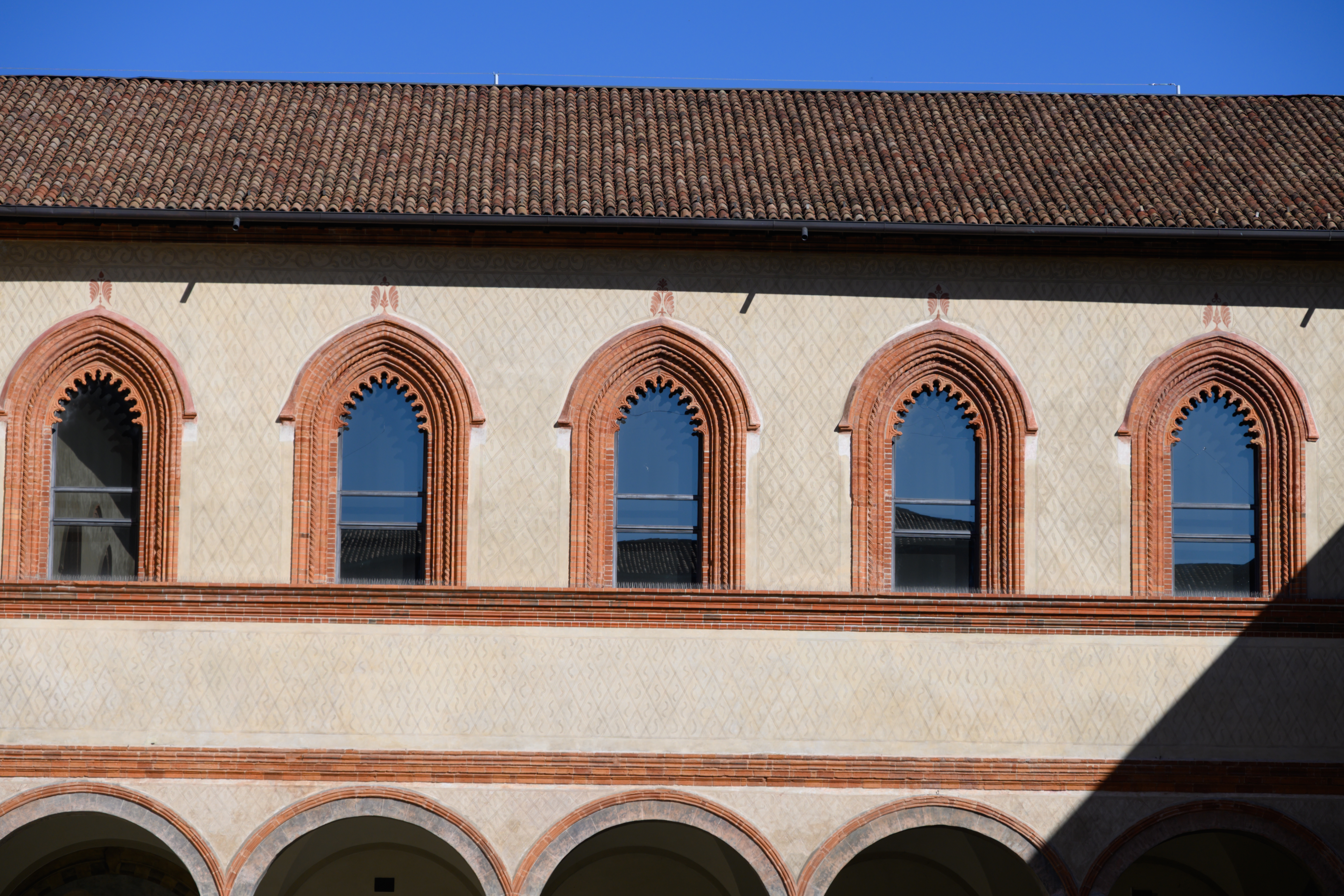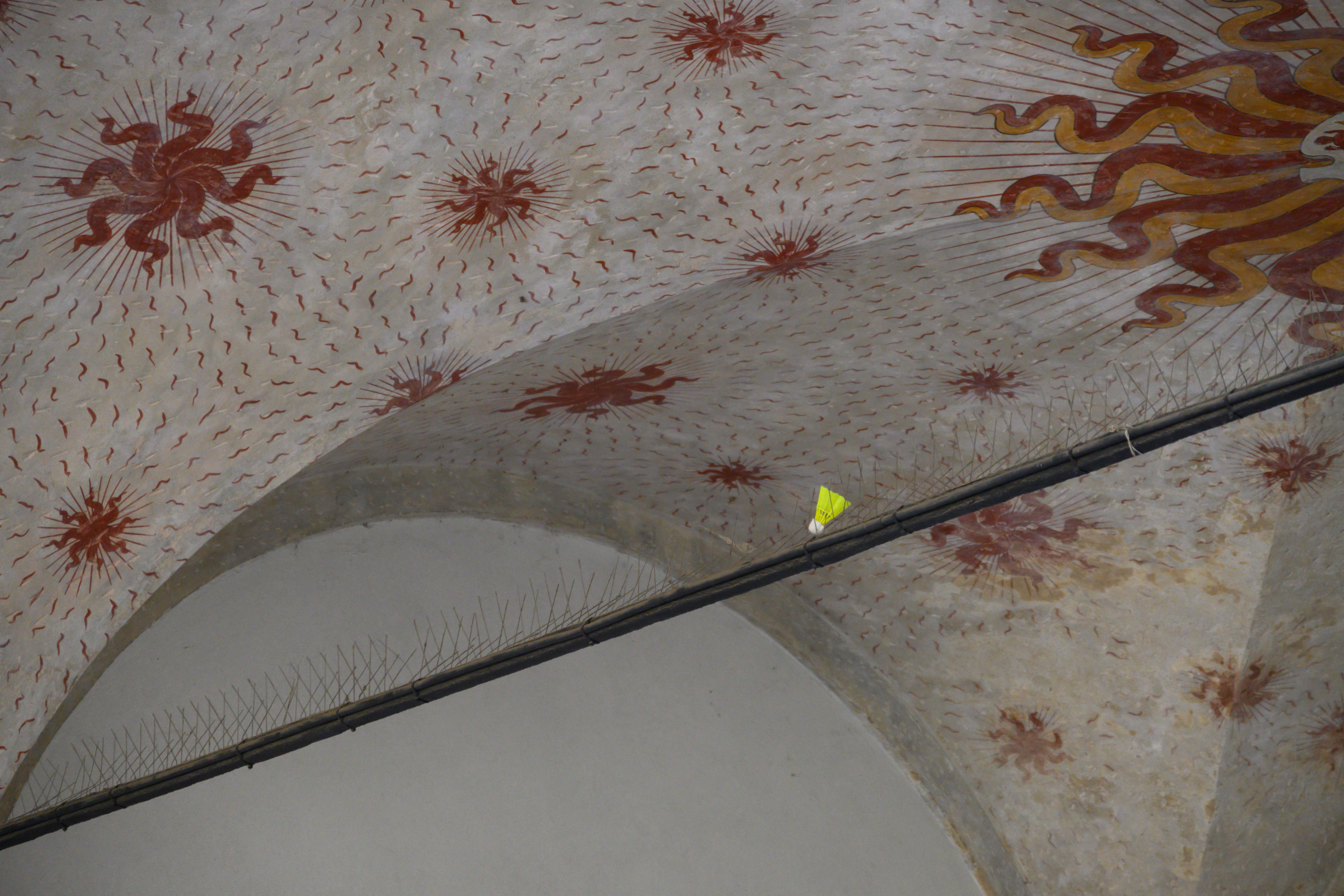 古堡的颜色基调是红棕色,里面院墙的装饰花纹很好看。有个荧光的羽毛球在墙之间的绳子上卡出了,-3 欧。仔细看会发现绳子上有很多钉子,在意大利的高处的廊柱上也会见到,这应该是为了防止鸟类筑巢,人们不方便清理,所以直接插上了很多钉子。